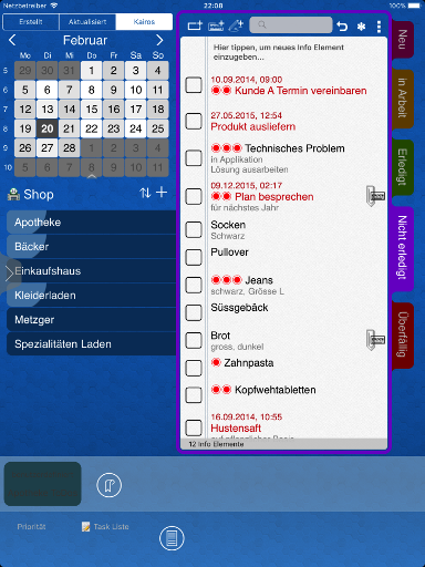 Der "Status" Bereich verfügt über einen zusätzlichen speziellen Filter/Selektion "Überfällig". Dieser Filter beschränkt die Liste auf die überfälligen (Kairos) und "nicht erledigten" Info Elemente ein.