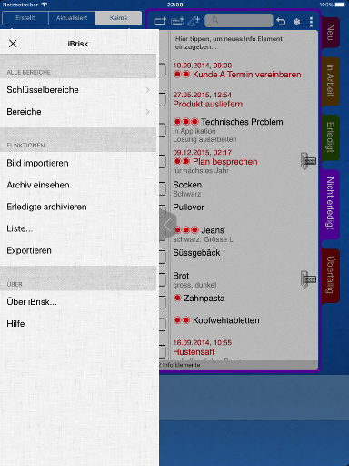 - Exportieren führt das Speichern auf dem Gerät aus sämtlicher Informationen (inkl. Anhänge) von iBrisk und erstellt die Datei "iBriskData.ibriskpkg". Diese Datei kann via iTunes Datei Austausch verwendet werden. Beim Aufstarten von iBrisk, prüft die App ob ein solches Paket vorhanden ist und fragt nach eine Bestätigung ob sämtliche Daten ersetzt werden sollen.