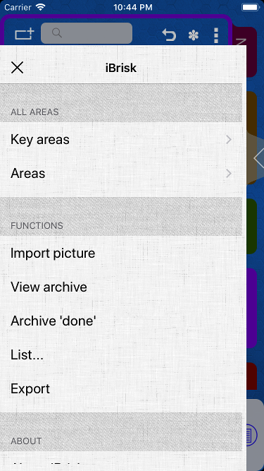 • Export creates on the device a file with all data of iBrisk (inlc. attachments, configuration etc.). This file can be shared via iTunes file sharing function and is called "iBriskData.ibriskpkg". The app checks on startup for existence of such a file, if found, a user confirmation is asked to replace the current data with the one from the file package. If you confirm with "Yes", all data will be replaced with the one from the package irreversably!